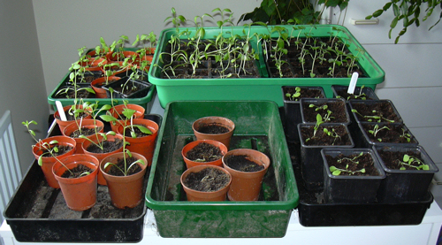 I can now report on the disadvantages of the half hardy annuals strategy. The main one is the difficulty of finding enough places in the house that get enough light to stop the seedlings becoming too spindly. As you can see from the picture, some of mine are a bit straggly. It is possible that they might have grown better if the room had been cooler.
