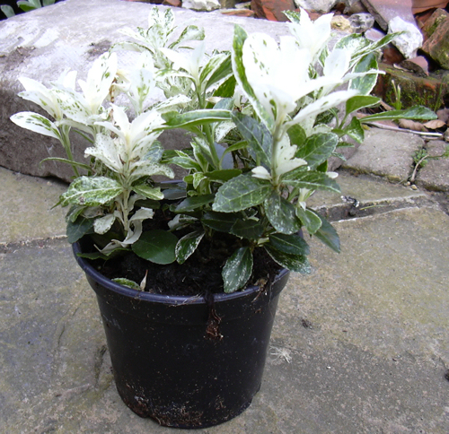 Last Saturday I happened to go to the library, and Fleet Market was just outside, and I just happened to see some plants that looked nice, so I impulse-bought a dwarf lilac rhododendron and also a euonymus of a type I don’t remember seeing before. The baby leaves of the euonymus are literally pure white, and then they become green and white variegated. I looked on Google Images, and I think it is euonymus fortunei ‘Harlequin’. I have already planted the rhododendron in the border by the side of the house, along with the red one that I got from B&Q two weeks ago, but no, I do not know where I am going to put the euonymus. The rhododendron was £3 and the euonymus was £2. Excellent value.