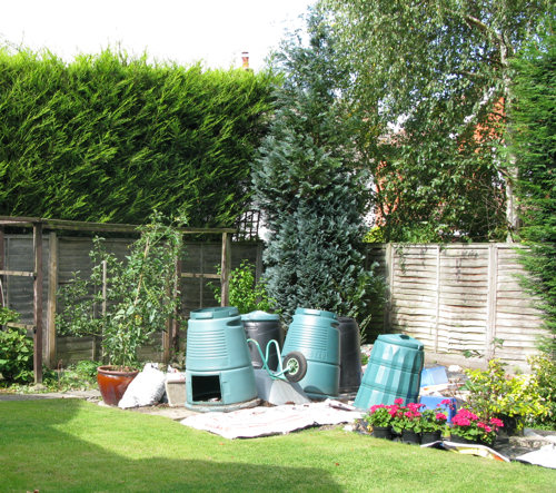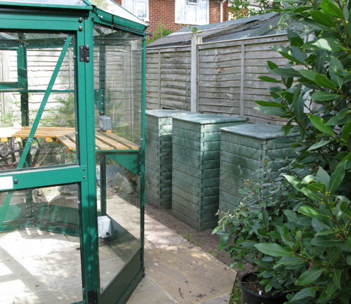 (4) I levelled the ground under the three compost bins next to the greenhouse so they can stand upright. I didn’t go as far as getting the bins all at the same height.