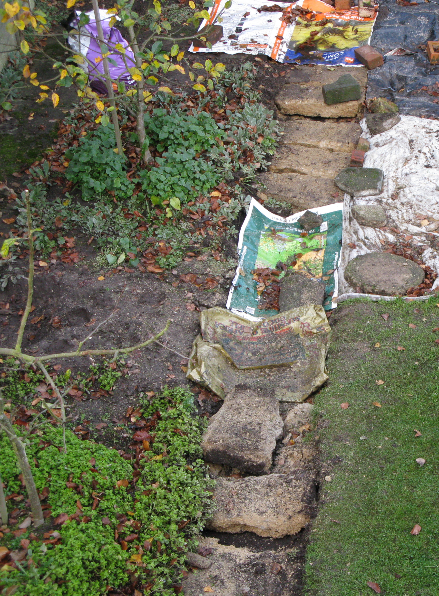 I have finished breaking up the path foundations, and have started putting out the poles and string to mark out where the lawn should go, according to my plan on squared paper. The lawn is to run diagonally across the garden to try and make it look longer. It doesn’t look as if I need to dig up the apple tree yet after all, but I may still yet move the lawn boundaries. It also looks as if the yellow euonymus can stay where it is for the time being. This is all good news because I am running out of time. As you can see very clearly, the recent winds have been very unkind to next door’s fence, and I was worried that the fence might fall on the apple tree and squash it. I stuck a brown piece of wood from the raspberry frame in the ground between the apple tree and the fence in the hope that it would take the brunt of any collision, but now that one panel has almost parted company with the post, the wind can get through the gap and I am hoping there will be no further damage.
