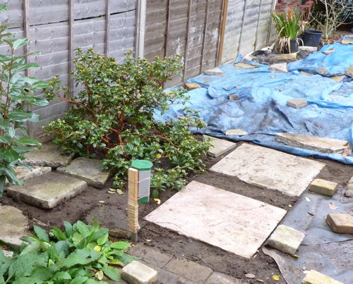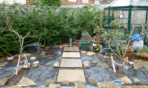 Some time in the future I am going to have to decide what to do about the stepping stones in the long term. I have laid them straight onto soil, and used a spirit level to make sure they are roughly level and at the right height. I have lined them up by eye, not with poles and string. I think I would like to get in a professional to lay them properly on mortar and make sure they are nicely lined up, but if I do that, I will have to delay planting around the stones until that has been done, or the plants will only get in the way. It is not easy laying paving stones, especially when they turn out to not be exact squares and the surface is irregular.I think it will be essential to grow lots of plants in between them to hide any imperfections in their positioning.