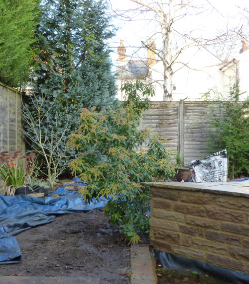I have also laid three stepping stones running up the side of the shallow pond. I planted the rhododendron to the left of the stepping stones. The rhododendron has grown enormous and it was very difficult to plant because its branches are so low down. After putting it in the hole I thought, sadly, that I would have to prune it.