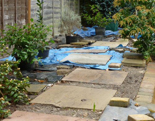 Once the buddleia had been relocated, I had another think about the left-hand border. The path of stepping stones does not run exactly parallel to the fence because I need it to diverge off to the left to avoid the pointy corner of the raised pond. The other consideration is that I need to make sure I do not block access to the fence posts because the posts rot and need to be replaced every few years, and my neighbours cannot do this work from their side of the garden because there is a Leylandii hedge in the way. The bay tree is a good choice to put where the buddleia was because it provides a nice green backdrop for the magnolia when viewed from the right, and it can be pruned to any size. I worked out that I could put three plants between the bay tree and the rhododendron, and I marked their positions with potted plants.
