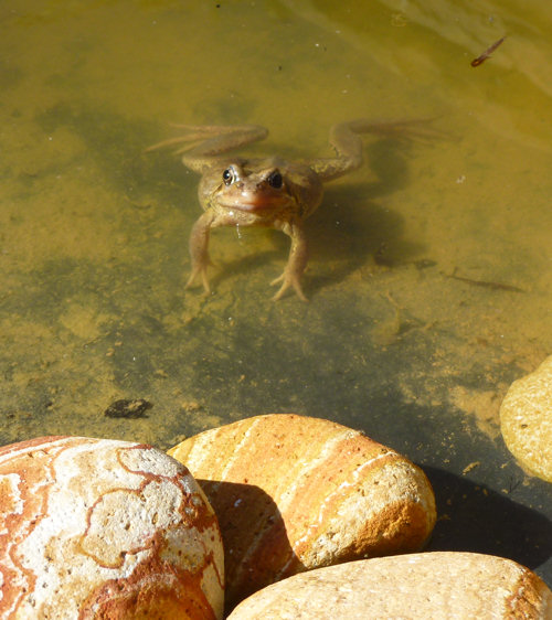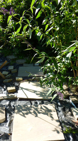 We had a brief shower this morning, but apart from that it has been dry for a week, and I have now emptied out the shallow pond. Sorry to the frog who visited earlier this week, but alternative accommodation is just a few yards away. My aim is to stop the leak between the render around the stone edging and the pond liner by neatening up the render, filling any gaps, and then using a pond sealant to plug the gap between render and liner.