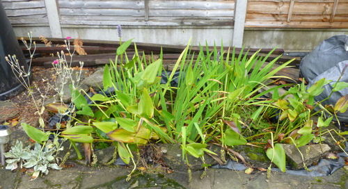 The level of water in the shallow pond continues to fall. I think it must be leaking from more than one place. I am thinking of various ideas about what to do. One option is to remove the liner entirely and replace it with a new liner that comes up along the back of the edging blocks. I don’t know whether this will affect the stablity of the edging blocks. Another possibility is to dig up the soil at the back of the two edges of the pond that don’t butt onto the patio, and then leave it, and see which bits become damp after rainfall. I would hope this would tell me whether there are particular places where the pond is leaking from. Taking up the patio to observe the edge that butts onto the patio would be drastic, but again could be done. However, I am going to leave this to be done after completion of the main project. I feel more strongly than ever it is time to bring this ship into the shore, and throw away the oars. Forever. I have had enough of the portable herbaceous border. I want a proper garden again.