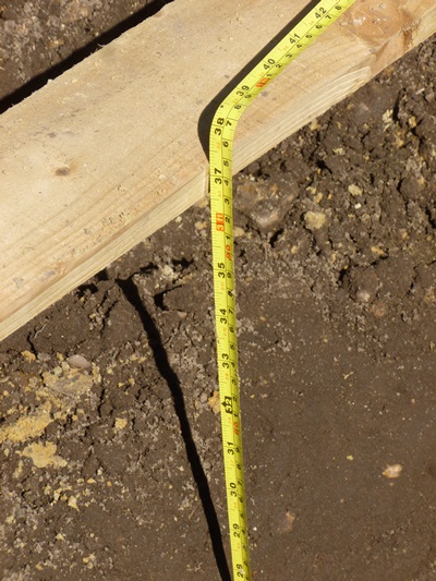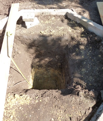 If you are wondering how I managed to get the earth out of a hole of such a small cross-sectional area, I did it by repeatedly folding myself in half with straight legs and arms. I couldn’t crouch down to get the earth out because there wasn’t enough room. I decided that the blog would not be enhanced by the inclusion of a picture to demonstrate this technique. The two bits of crazy paving to the right are there in case I needed something to step onto in order to get out of the hole. Fortunately I didn’t have any trouble extricating myself.