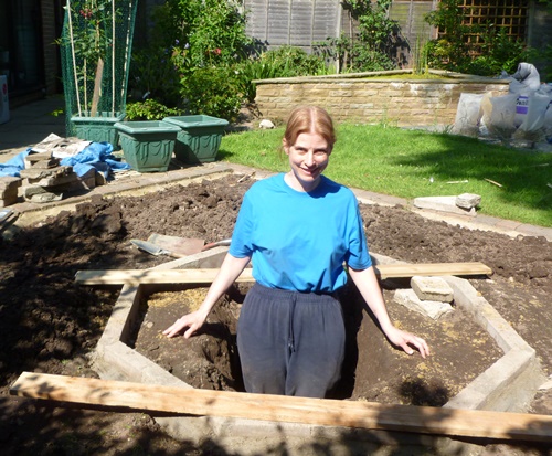 Yesterday I reinforced the edges of the pond by applying some mortar all around the outside edges. This seems to have done the trick – today they felt very solid. So today was the day for digging out the pond.
