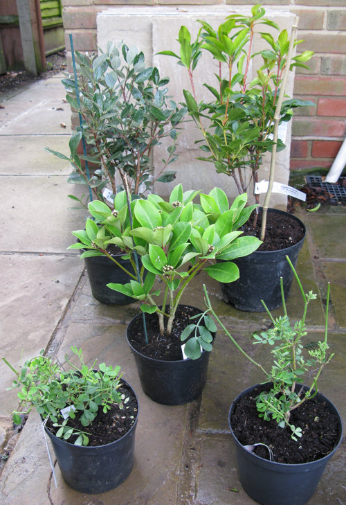 After my plants from Buckingham Nurseries arrived, I ordered some more plants from Burncoose Nurseries in Cornwall. Their plants were more expensive than those from Buckingham Nurseries (although bigger) but they do an excellent range of plants that are hard to get from anywhere else. I ordered an acca and a kalmia. The kalmia, together with the holly that I bought from Buckingham Nurseries, will replace the bay tree and will help shield the compost bins from view. I also ordered a skimmia to go in the side border. I wanted a female one because it does berries and because there are some male ones in the communal shrubbery on the other side of the road, and I thought it was a bit of a waste having male skimmias if there weren’t any female ones for them to have berries with.