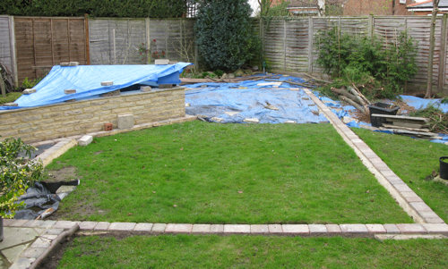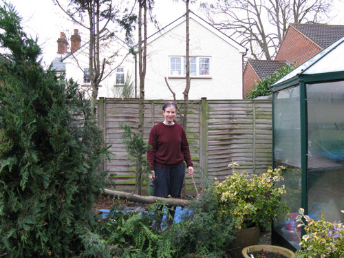 This means that the grass is going to start growing any minute, and weeds will appear in the patches of bare earth. And I am now having the busiest March for tutoring since 2008 – I am turning people down because I have no space until after the summer exams start. The most important job is still to remove the Leylandii, but I also need to make sure the rest of the garden is as little bother as possible while I carry on with Renovation. So I have cut a straight line across the new lawn, and covered the bare earth section with bits of pond liner and compost bags and a tarpaulin. That should stop any weeds until I have time to dig it over and sow some seed. This won’t be until the autumn at the earliest. Apart from mining the area for additional earth, I can leave it to its own devices until then. Fortunately I correctly chose this week to take off work. The forecast is for dry weather all week, so I hope to get a lot done.
