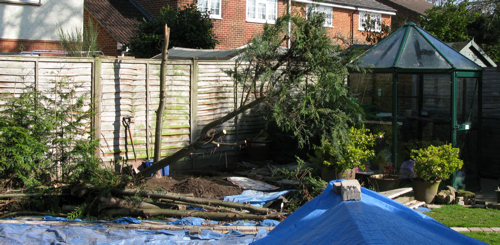 Then I tied the tree to the ones next to it, using two ropes. I sawed through the biggest roots, which took about half an hour, and then I gave the tree a little push to encourage it to fall in a direction where the greenhouse wasn’t.