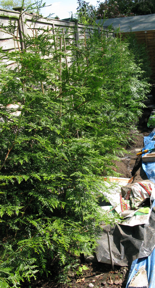 It’s definitely time to start planting. The major job is to get the six big thuja into the ground instead of the Leylandii. I have now removed all but one of the Leylandii, and have partly dug up the remaining one. I took the following picture last week, when I made a lot of progress because I took the week off work and it didn’t rain.